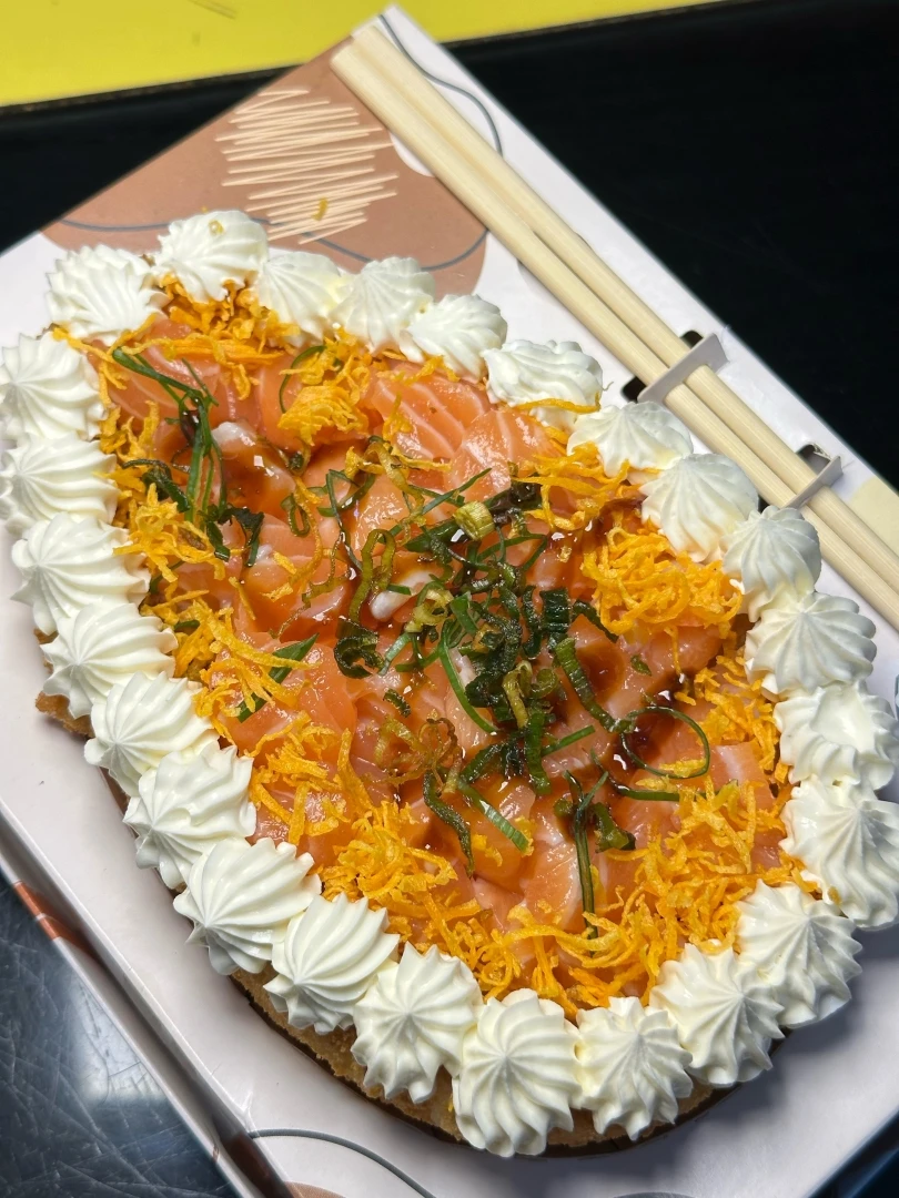 SALMÃO CRU (80g) CAMARÃO EMPANADO (70g) CREAMCHEESE CREME CHEDDAR CRISPY DE BATATA DOCE CRISPY DE ALHO PORÓ MOLHO DE OSTRA SWEET CHILLI Base: 250g de Arroz Japonês Empanado e Frito. Embalado lindamente para uma ocasião especial! Total 600g